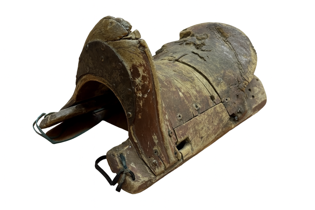 Седло на деревянном остове (вяз-карагач). Седло составное из 6 деталей. Имеет следы кустарной реставрации. Лицевая сторона передней луки высокая, украшена декорированной пластиной с растительным орнаментом, узоры выполнены в технике насечки, пластина к луке прикреплена с помощью 11-ти декоративных гвоздей.
