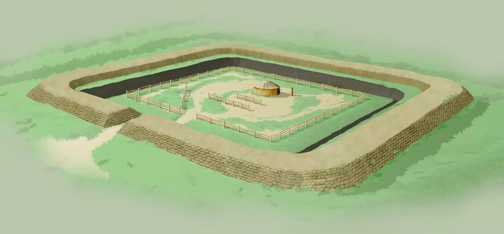 Из трех кварталов наиболее полно изучен северный. Он представлял собой площадку размером 35×35 м, заглубленную в землю на 0,5 м. Площадка имела три линии ограждений: сначала деревянный тын, затем ров глубиной 3 м и шириной до 5 м, а снаружи – стена. Ширина ее основания составляла около 8 м, верхняя часть – 5 м, высота достигала 2–3 м. Стена была сложена из сырцового кирпича и пахсовых блоков, изготовленных из глины, извлеченной при рытье рва. Вход находился только с южной стороны, его ширина составляла 2,3 м.