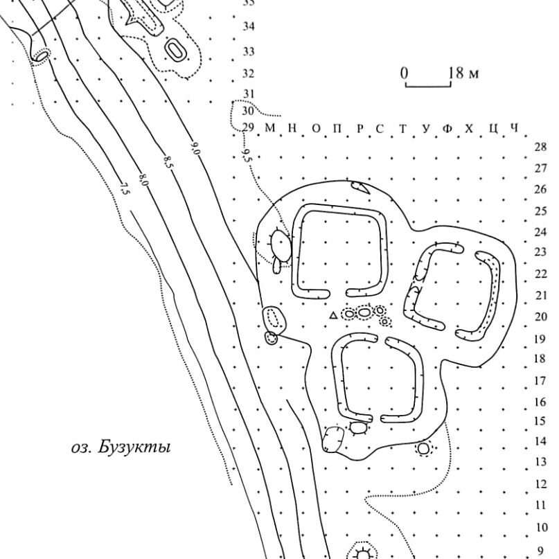 Самый древний памятник, возникший на восточном берегу озера Бузукты, – это городище Бозок. Выбор восточного берега не был случайным: в период половодья все пространство между реками Нура и Ишим затапливалось, и лишь восточный приподнятый берег озера Бузукты, где располагалось городище, оставался сухим.